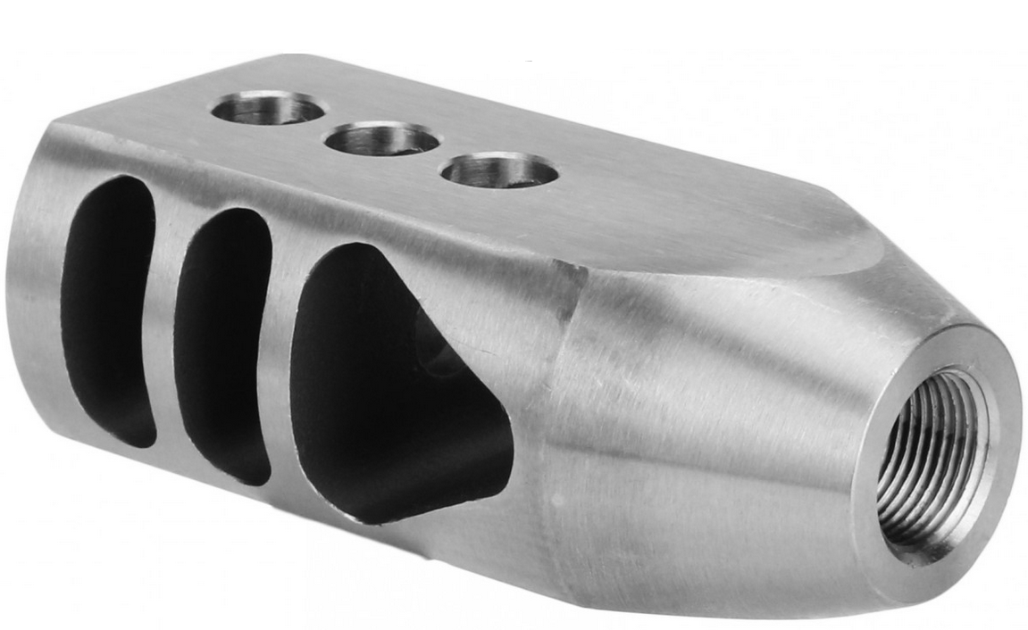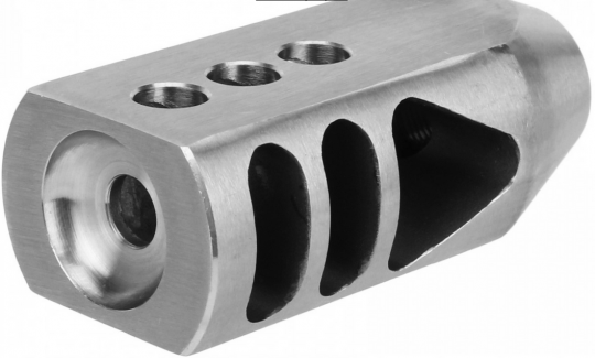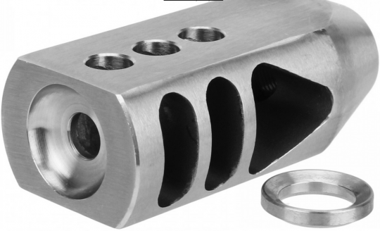 Dieser Mündungsfeuerdämpfer ist eine vollständige Edelstahlkonstruktion mit einem hitzebehandelten, erosionsbeständigen Silberfinish. Im Lieferumfang ist auch ein 5/8X24 Schaftkappenwinkel enthalten. Mithilfe dieses Mündungsfeuerdämpfers lassen sich Rückstoß und Hochschlag beim Abfeuern des Projektils merklich reduzieren.