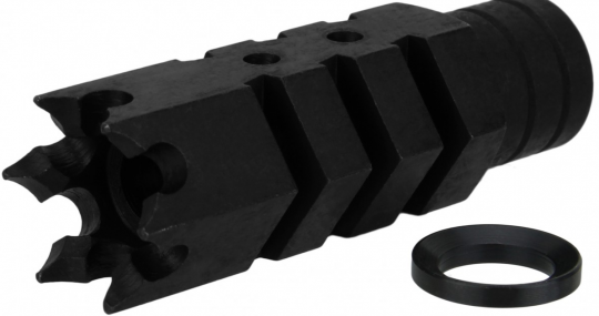 Dieser Shark Style Mündungsfeuerdämpfer ist eine vollständige Stahlkonstruktion mit einem hitzebehandelten, erosionsbeständigen Finish. Im Lieferumfang ist auch ein 5/8"x24 Schaftkappenwinkel enthalten. Mithilfe dieses Mündungsfeuerdämpfers lassen sich Rückstoß und Hochschlag beim Abfeuern des Projektils merklich reduzieren. Das eindrucksvolle, aggressive Design mit Stahlzacken dieses Sharp Style Mündungsfeuerdämpfers ist ästhetisch ansprechend und eignet sich auch gut für die Verteidigung in Nahkampfsituationen.