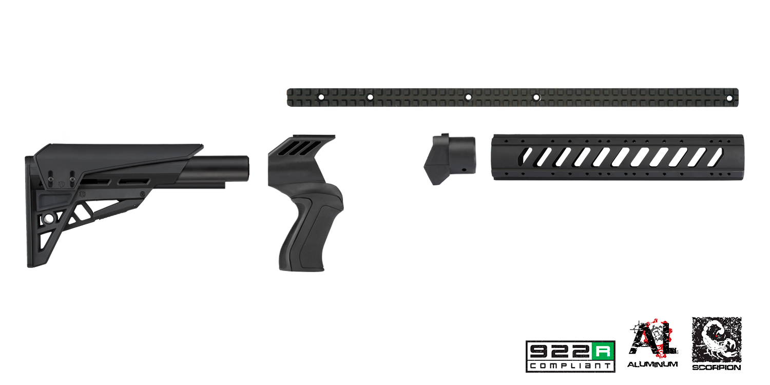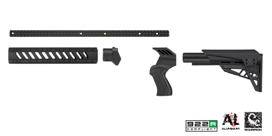 - Lieferumfang: Schubschaft, Griff, Handschutz, Wangenauflage, Schaftkappe, Buffer-Tube, Riemenbügelösenaufnahme, Weaver- / Picatinnyschiene und Montagematerial