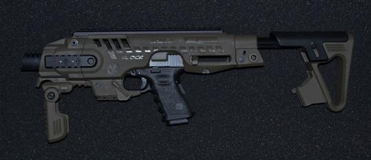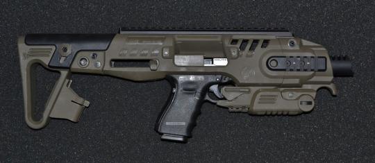 Schaftsystem RONI G2 für die Glock 17 / 19 / etc.. Ein System aus Polymer und Aluminium, der halbautomatische Pistolen in handliche Karabiner verwandelt, die sich zur Selbstverteidigung, für das Sportschießen und für taktische Einsätze eignen.