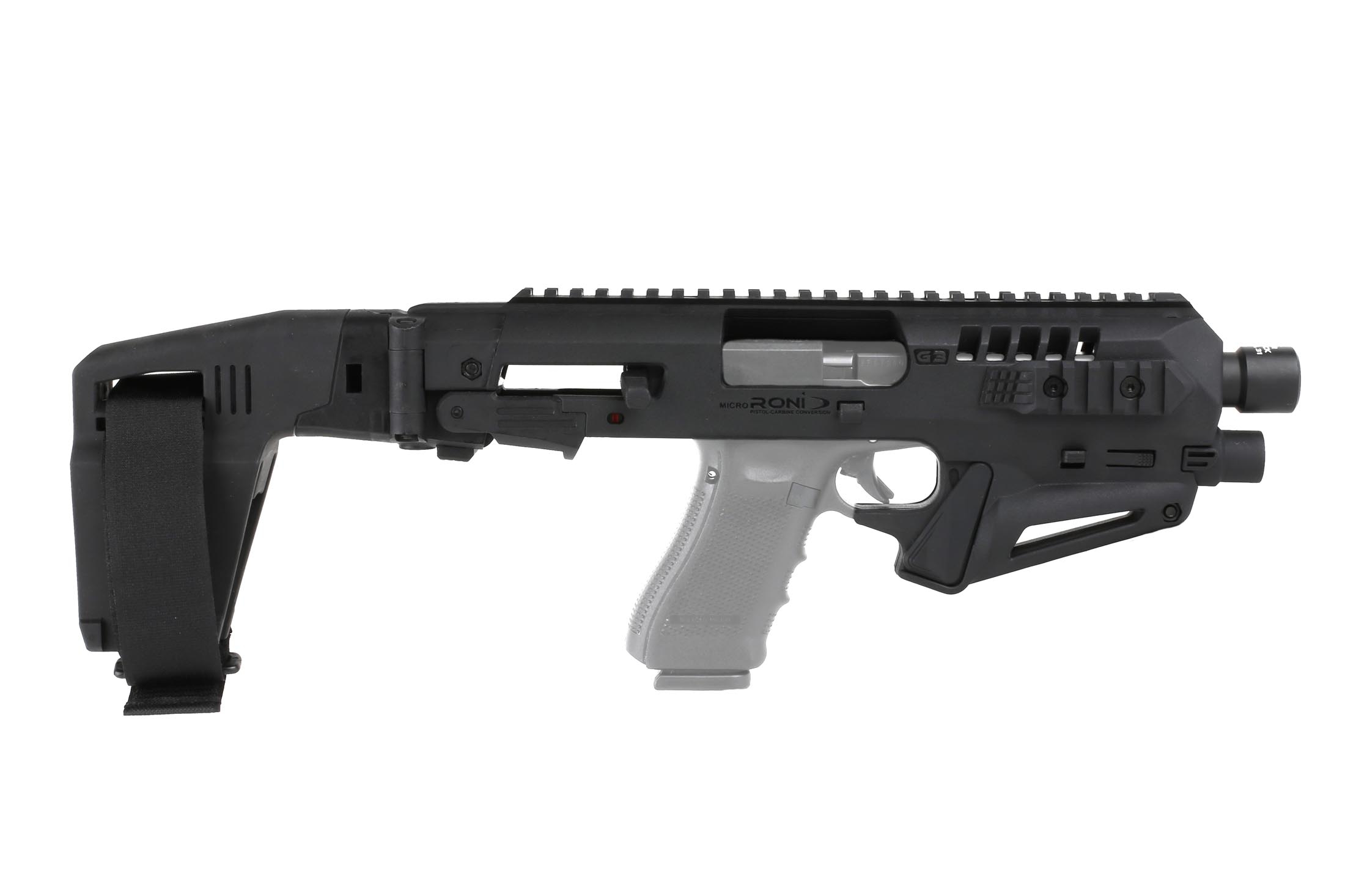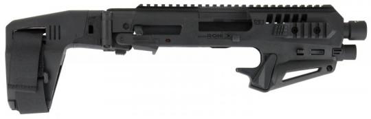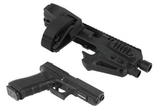 Schaftsystem MICRO RONI STABILIZER MODELL für GLOCK-Pistolen. Ein System aus Polymer und Aluminium, der halbautomatische Pistolen in handliche Karabiner verwandelt, die sich zur Selbstverteidigung, für das Sportschießen und für taktische Einsätze eignen.
