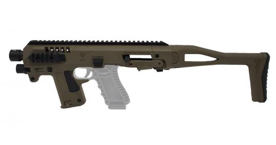 Schaftsystem MICRO RONI für GLOCK-Pistolen. Ein System aus Polymer und Aluminium, der halbautomatische Pistolen in handliche Karabiner verwandelt, die sich zur Selbstverteidigung, für das Sportschießen und für taktische Einsätze eignen.