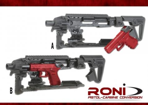 Schaftsystem RONI G2 für GLOCK-Pistolen. Ein System aus Polymer und Aluminium, der halbautomatische Pistolen in handliche Karabiner verwandelt, die sich zur Selbstverteidigung, für das Sportschießen und für taktische Einsätze eignen.
